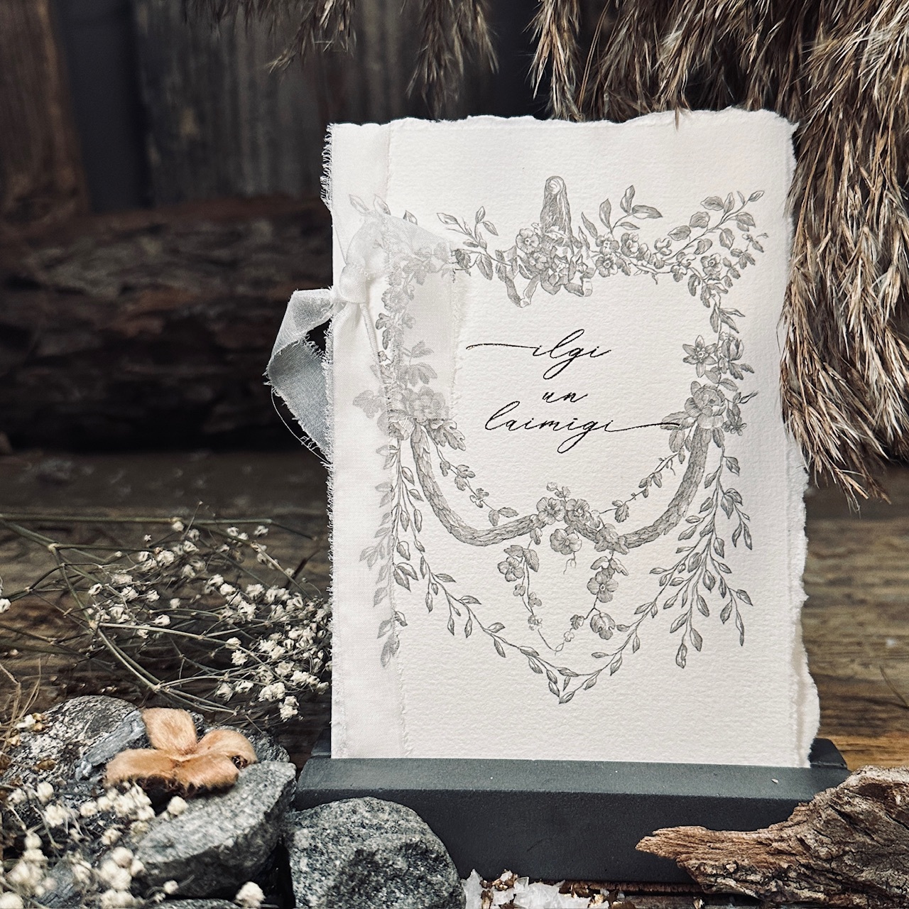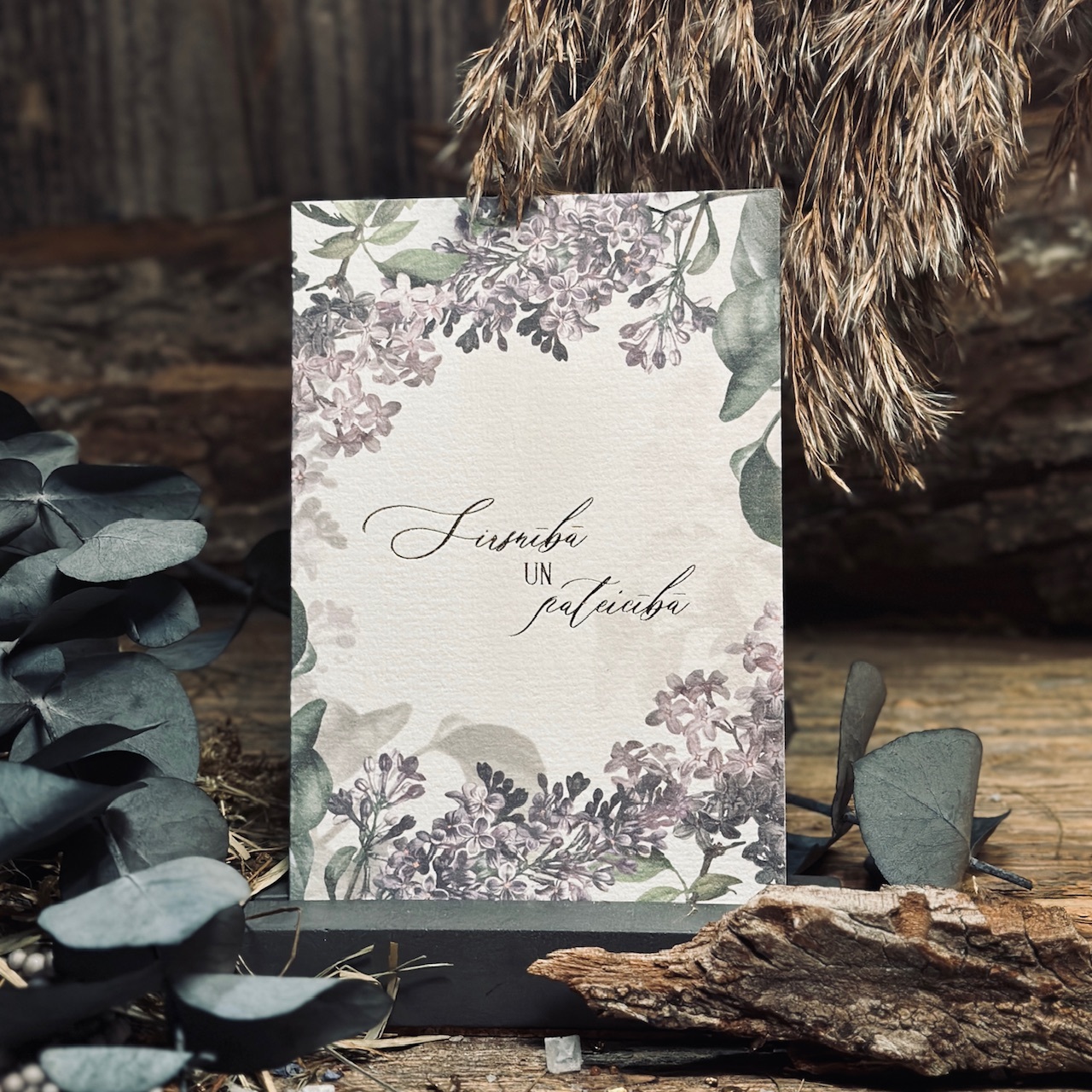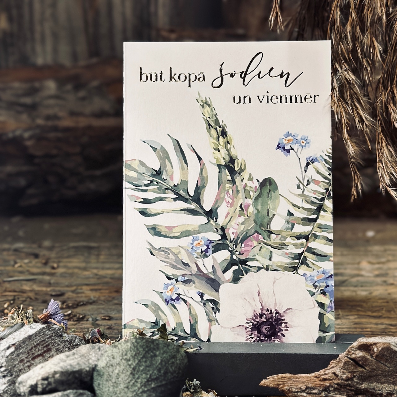 Opening greeting card on smooth paper with a white background and greens and flowers drawn in watercolor technique, in light tones and golden letters printed in relief printing in two different fonts "To be together today and always"
