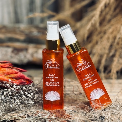 Eļļas izsmalcinātais un sabalansētais sastāvs (kokosriekstu, burkānu, buriti, mežrozīšu, smiltsērkšķu eļļas, annatto ogas, vizla, Sal koka sveķi) :