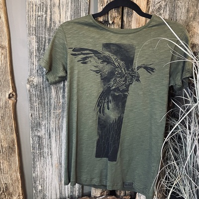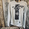 Džemperis ar putna apdruku drukāts sietspiedes tehnikā uz pašu ražota džempera, auduma sastāvs 92% kokvilna un 8 % elastāns (zaļajiem džemperiem) vai 80% kokvilna un 20% poliesters (pelēkiem un brūniem džemperiem).