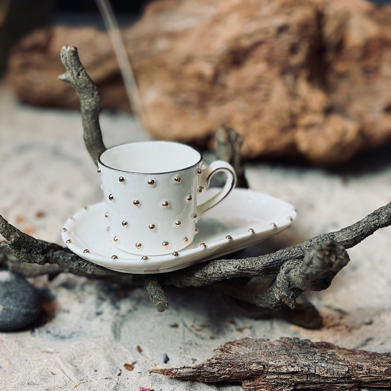 Šīs elegantās krūzes ir roku darbs, kas tapis no Mont Blank porcelāna. Tās ir atlietas ģipša formā, savukārt katra katra mazā pumpiņa ir pielikta atsevišķi un vēlāk pārklāta ar zeltu. Krūzes ir dedzinātas trīs reizes maksimālajā temperatūrā 1280°C, kopumā krāsnī pavadot 70 stundas. Caurspīdīgā un krāsainā glazūra ir droša lietošanai pārtikas produktiem, turklāt tā neļauj uzsūkt pārtikas aromātus. Krūze būs piemērota gan kafijas, gan tējas baudīšanai, un, saudzīgi to lietojot, tā var kļūt pat par ģimenes relikviju, kas tiek nodota no paaudzes paaudzei.