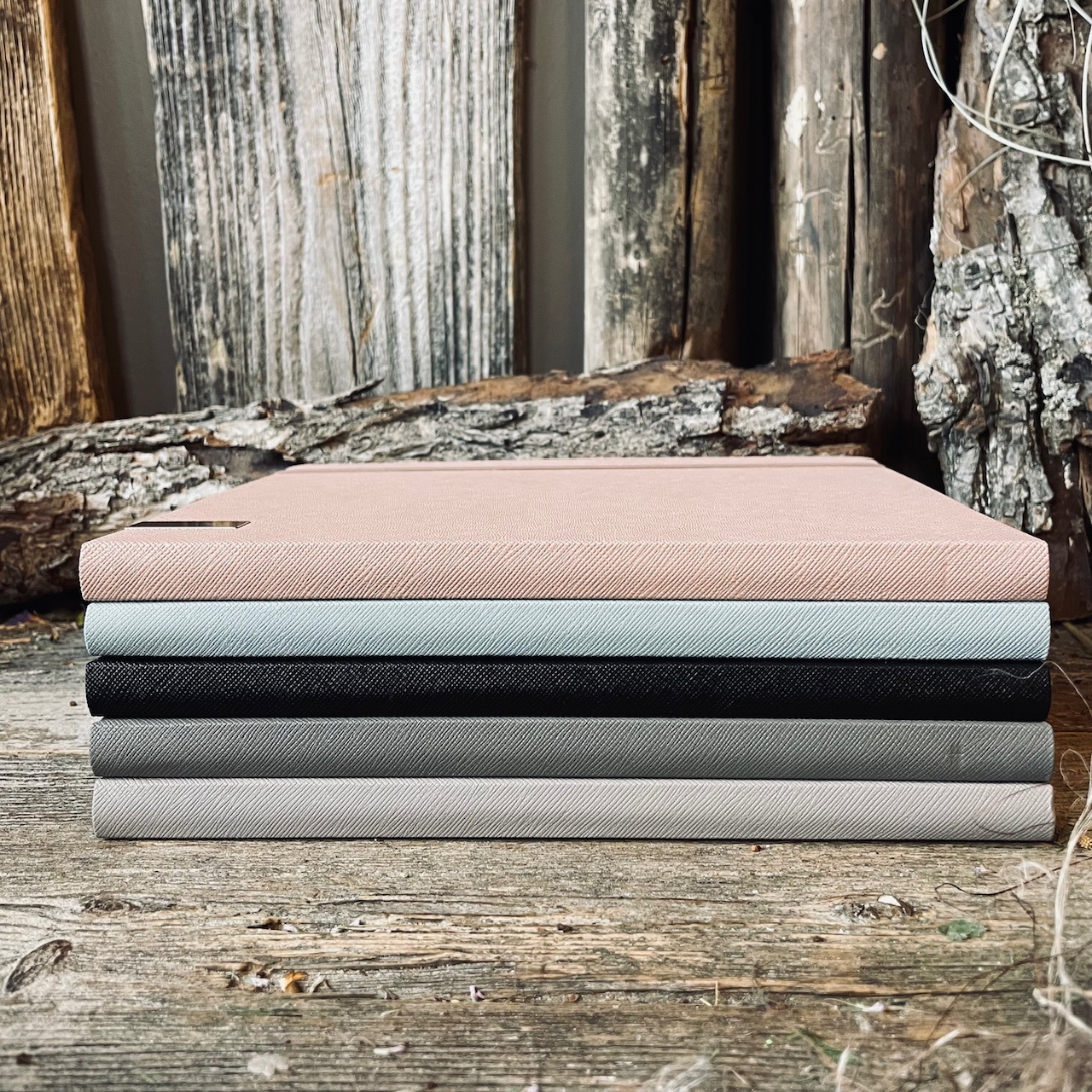 Dizaina papīra priekšlapas, gumijas aizdare, apaļoti stūri, šķīrējlenta.