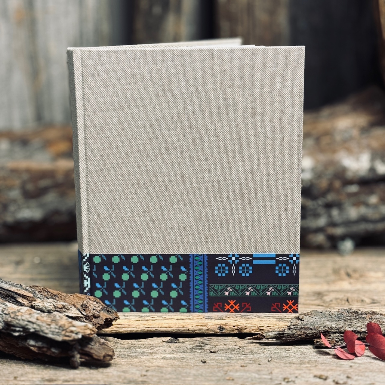 Cietais sējums, piezīmju grāmata ar šūtām lapām, auduma iesējums savienojumā ar papīra apdruku.