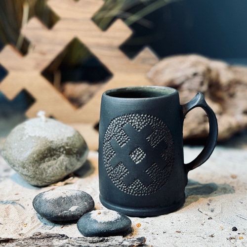 Veidots ar rokām uz podnieka ripas no Latvijas māla un apdedzināta atklātās uguns krāsnī melnajā/svēpētajā tehnikā. Apdedzināšanas temperatūra 1050 °C. Dekorēts gravēšanas tehnikā, izmantojot latvju rakstu motīvus.