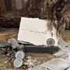 Balta kartīte no rokām plēsta papīra ar tekstūru, tekstu "No sirds", ar zaru motīvu maigā tonī un elegantu dekoratīvu akcentu uz kartītes malām ar sudraba foliju.